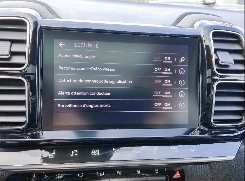 Pack Confort, Pack Drive Assist (BVA), Pack Safety +, Phares antibrouillard, Prise USB, Radar de stationnement AR, Radar de stationnement AV, Radio numérique DAB, Reconnaissance panneaux de signalisation, Régulateur de vitesse, Rétroviseur intérieur électrochrome, Rétroviseurs rabattables électriquement, Services connectés, Siège conducteur chauffant, Siège conducteur électrique, Siège conducteur réglable en hauteur, Siège passager chauffant, Siège passager réglable en hauteur, Sièges arrière coulissants, Système d'accès sans clé, Système de contrôle des angles morts, Système de prévention des collisions, Système d'éclairage intelligent, Verrouillage centralisé à distance, Vitres arrière surteintées, Volant cuir, Volant multifonction, Volant réglable en profondeur et hauteur, Lunette arrière surteintée, Limiteur de vitesse, Kit mains-libres Bluetooth, Frein stationnement électrique automatiq, Fonction MP3, Feux de jour à LED, Feux arrière à LED, ESP, Démarrage sans clé, Clim automatique bi-zones, Citroën Connect Nav, Capteur de pluie, Appel d'Urgence Localisé, Appel d'Assistance Localisé, Allumage des phares automatique, Aide stat. AV + Caméra Top Rear Vision, Aide au freinage d'urgence, Aide au démarrage en côte, AFIL, ABS, 6 Haut parleurs, 3 sièges individuels en rang 2, Pare brise chauffant, TO panoramique + Pk Look Silver Anodisé, Recharge sans fil pour smartphone, Pack Park Assist, Pack Grip Control, Hayon mains libres, Gris Platinium, Attelage + Ctrl stabilité de l'attelage